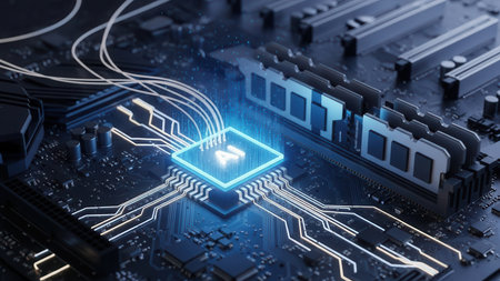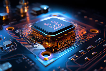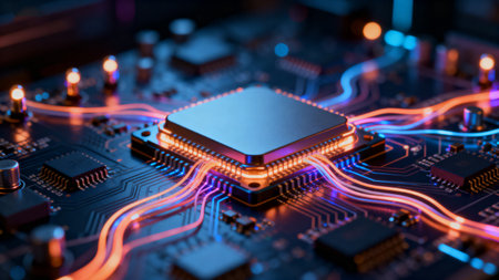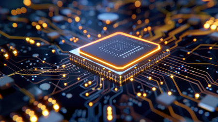 A detailed scene featuring a futuristic microprocessor positioned on a circuit board, highlighted by glowing connections that symbolize advanced technology and innovation.