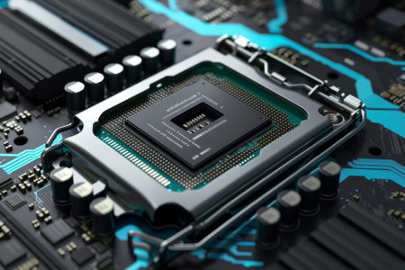 Processor chip on computer circuit board. AI generated