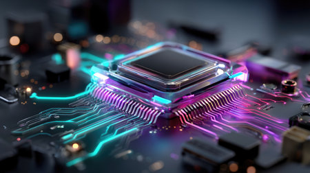 Abstract close up of a modern microchip on a glowing circuit board with vibrant neon lights in pink, blue, and orange