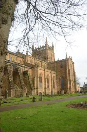 Dunfermline Scotland - September 15 2019: Side view of the beautiful Dunfermline Abbey with clear blue skies, UK September 15, 2019