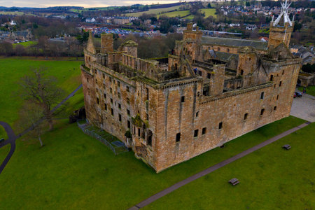 Aerial view of Linlithgow Castle Ruins, the birthplace of Mary Queen of Scots in West Lothian, Scotland.