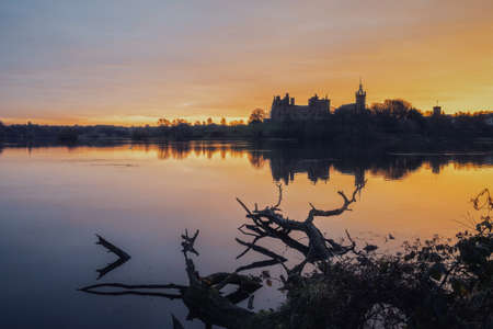 Old Scottish castle on the lake at sunrise. Trees in the water in the foreground. Linlithgow Palace, Scotland