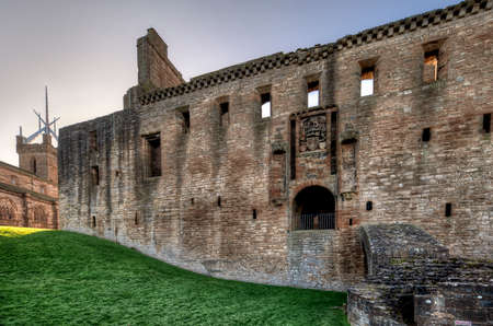 Counrtyard with brick walls in Linlithgow Palace, Scotland, UK at sunset