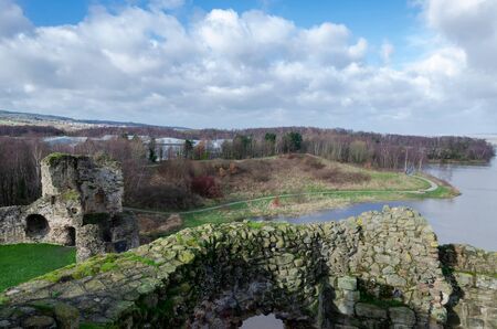 Flint Castle in Flintshire, North Wales with an unusually high spring tide. The flood water of the nearby River Dee approaches the walls of the castle.