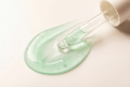 A transparent pale green cosmetic serum swatch with bubbles and a glass pipette dropper rests in the liquid gel texture on a clean white surface for minimalistic skincare and beauty concepts.