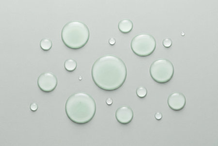 A collection of clear round liquid droplets with a subtle green tint scattered across a smooth light grey surface representing hydration and skincare purity.