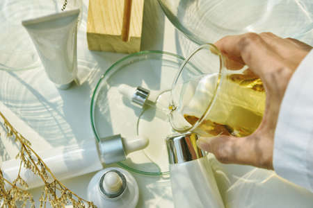 Scientist mixing natural skincare beauty products, Organic botany extraction and scientific laboratory glassware, Blank label cosmetic container for branding mock-up.