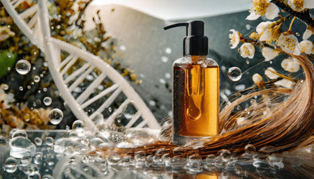 beauty treatment and health care concept - close up of serum or oil bottle on glass surface with dna strand and flowers