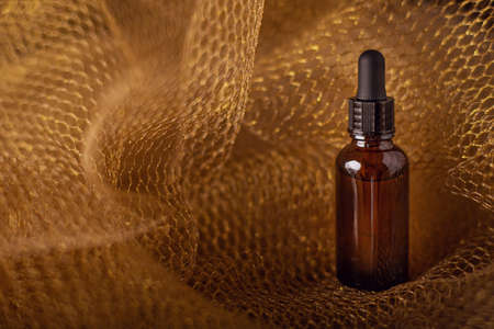 Cosmetic glass bottle with pipette dropper dispenser on background of golden honey mesh with soft focus. Studio shot with copy space. Facial skin care concept, make-up.