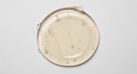 Glycerin gel texture. Transparent serum drop on beige background. Liquid gel moisturizer with bubbles macro.
