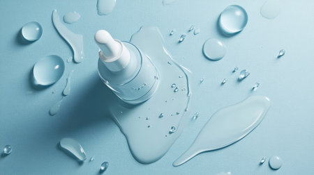 Hydrating skincare routine featuring moisturizer and hyaluronic acid with droplets on a blue surface. Perfect for showcasing lotions and serums.