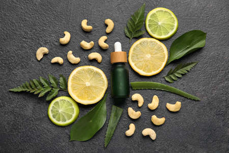 Bottle of natural serum with lemon slices, plant leaves and cashew nuts on dark background