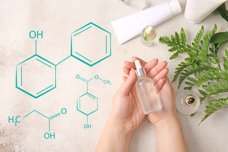 Female hands with natural essential oil in bottle and cosmetics on gray background