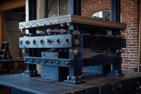 Detailed view of a modern hydraulic press in an industrial setting, showcasing mechanical engineering