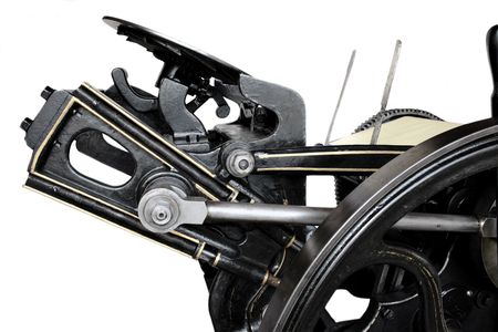 a 1901 printing press showing bolts, gear and inking disc against a white background