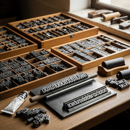 A collection of letterpress printing blocks and tools on a wooden worktable in a studio