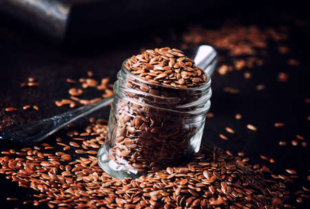spice jar with flaxseeds close-up shot of pantry ingredients, concept of simple toppings to flavour your dishes