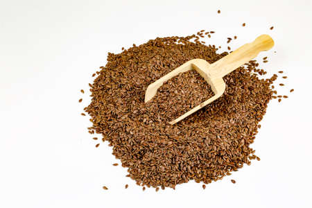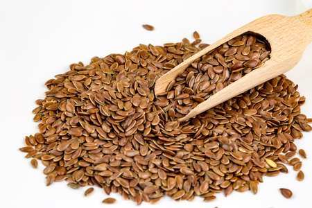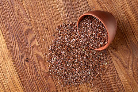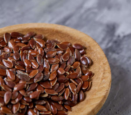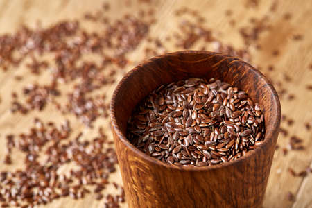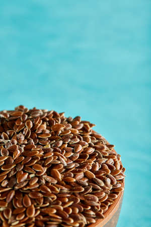 Healthy food for preventing heart diseases and overweight. Flax seeds linseed heap closeup on wood background