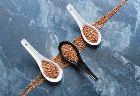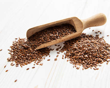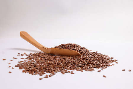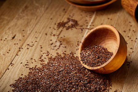 Healthy food for preventing heart diseases and overweight. Flax seeds linseed on wooden spoon wood background
