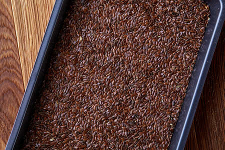 Nutritious flaxseed on baking tray over wooden background, selective focus, shallow depth of field. Nutritious and deitary ingredient. Natural organic condiment. Healing oilseed. Healthy lifestyle concept.