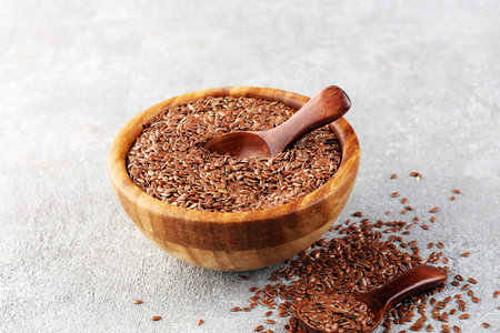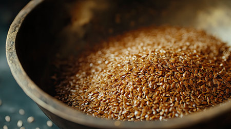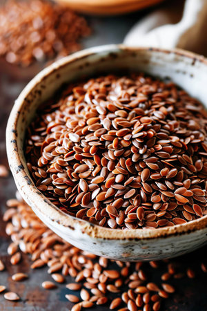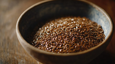 A detailed close-up image showcasing brown flax seeds in a rustic wooden bowl. Perfect for promoting healthy eating, nutrition, and natural food ingredients.