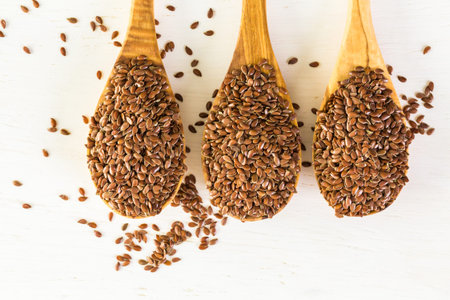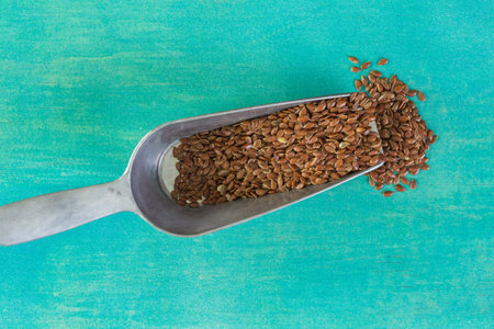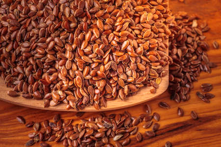 Top view, close-up picture of wooden spoon full of flax seeds over some seeds composed on rustic brown wooden background, shallow depth of field, selective focus, front focus. Organic ingredient for healthy lifestyle