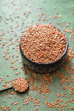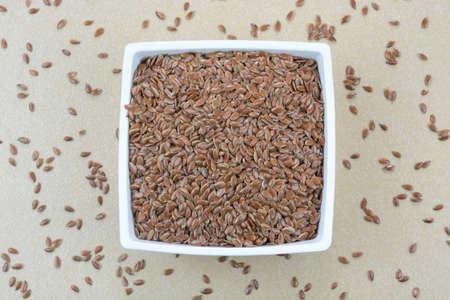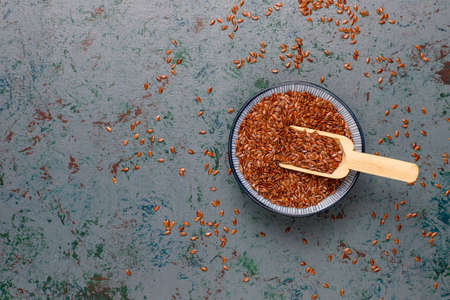 Bowl full of brown flaxseed or linseed. Cereals. Vitamins. Healthy food.