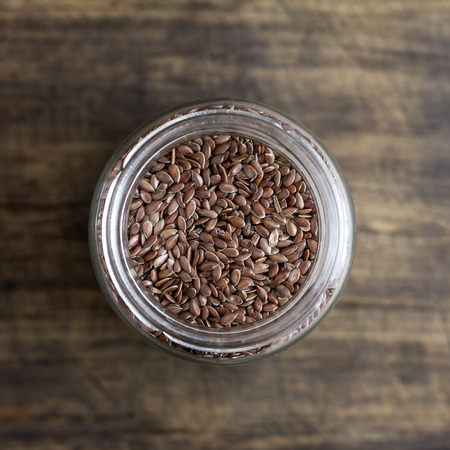 Flex seed flaxseed closeup in small glass jar bottle sprinkled seeds top view