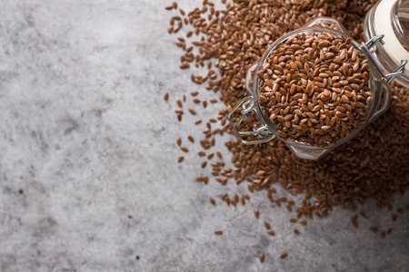Flax seeds in a glass jar on a gray textured background, top view. Healthy food, superfood.