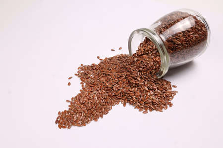 Flex seed flaxseed closeup pouring from small glass jar bottle sprinkled seeds