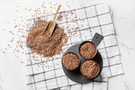 Flax seeds in bowl and flaxseed oil in glass bottle on light textured background, top view, close-up, selective focus