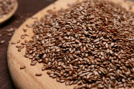 Healthy food diet. Closeup brown flax seeds linseed on wooden spoon