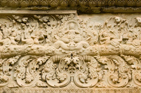 Ancient Khmer stone lintel carved with images of devatas, or gods, riding on elephants Bakong Temple, Angkor, Cambodia Ancient carving, hundreds of years old