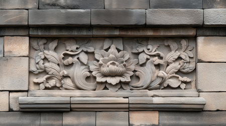 Intricate stone floral carving on ancient architectural facade. Historical ornamentation and cultural heritage