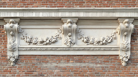 Beautifully decorated brick cladding wall with ornate white stucco detailing along the top border.