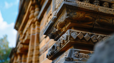 This image showcases intricate stone carvings on a historical temple structure, illuminated by soft natural light. The detailed craftsmanship highlights the rich heritage and artistic design of ancient architecture, inviting exploration and appreciation.