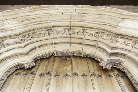 Old porch of a church, detail of a gothic church decoration in ne Spain, ancient art