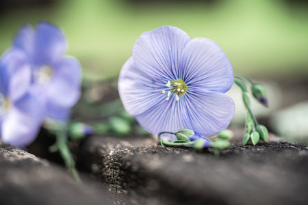 Stunning close-up photo of blue flax flowers highlighting their delicate petals and vibrant color an old wooden plank.