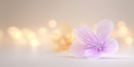 A delicate purple flower rests against a softly illuminated background, adding a touch of color to a calm setting with warm bokeh effects.
