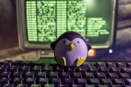 A cute penguin toy programmer coding on computer keyboard with green matrix background