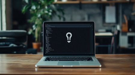 A sleek laptop with a dark screen sits on a wooden desk in a stylish workspace, surrounded by minimalistic decor and a lively plant, showcasing modern productivity.