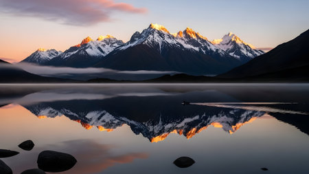 Majestic snow capped mountains reflecting in a still lake at sunrise, creating beautiful golden light and tranquil scenery.