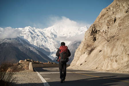 rear view of an asian hiker with backpack walking on highway with snowcapped meili mountain in background