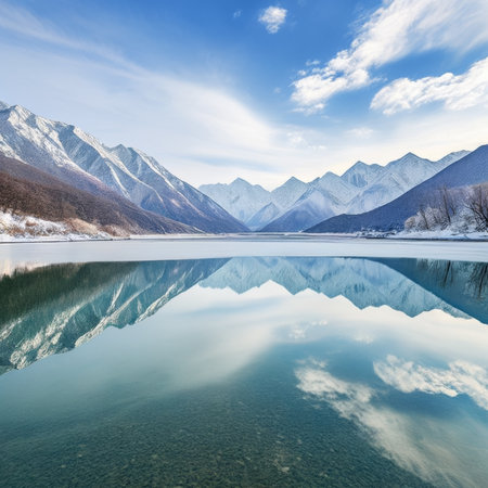 Reflecting natural scenery of snow capped mountains