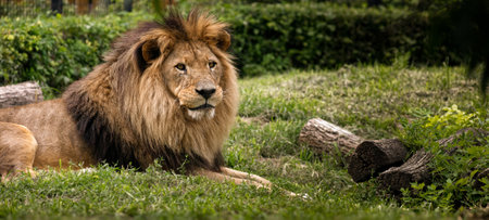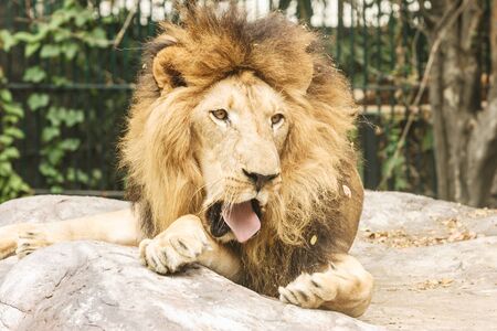 Closeup solemn big male Lion lying on artificial wood bench with green nature background.