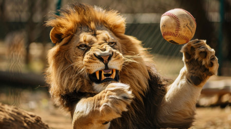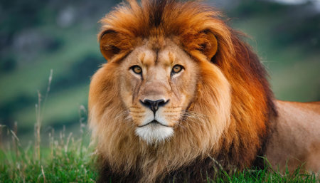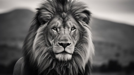 the essence of raw power and regal dominance converges. A magnificent lion locks eyes with the viewer, its intense gaze cutting through the distance between species. The lion's aura exudes an air