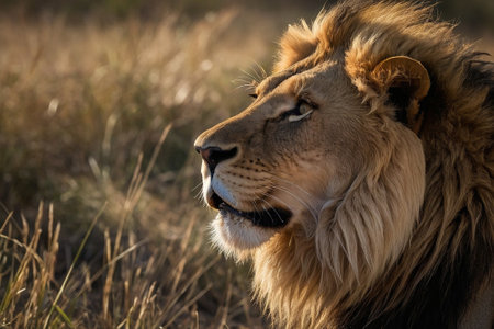 A stunning close-up portrait of a lion in profile, showcasing its majestic features against a backdrop of golden grass in soft focus.