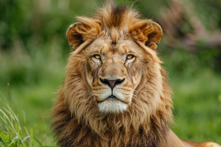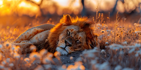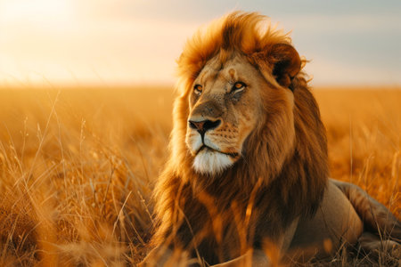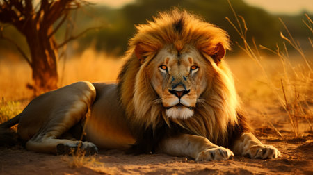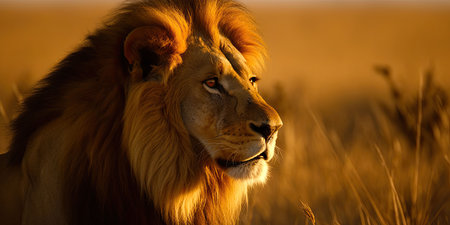 A striking lion with a full mane is the focal point of this image, bathed in warm, golden light. The composition features a shallow depth of field, emphasizing the lion's detailed features against a blurred background. This photograph could be used for various commercial projects related to wildlife, nature, or conservation efforts.
