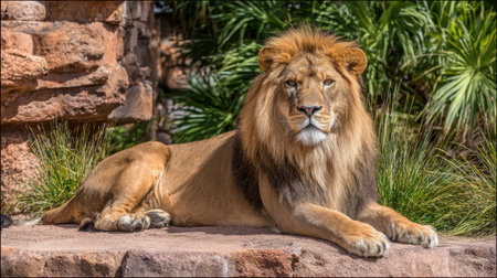 A powerful male lion with a magnificent mane lies royally on a stone ledge, surrounded by vibrant green foliage.
