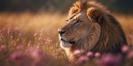 An AI generated illustration of a majestic male lion in a grassy meadow